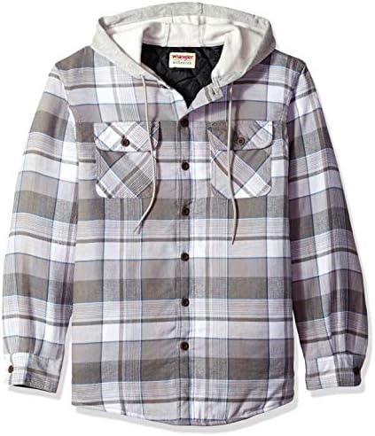 Wrangler Authentic men’s quilted long sleeve lined Flannel with hood. This flannel features polyester lined body interior, two pockets, and brushed flannel exterior making it the perfect jacket for those cold winter nights. The jacket offers versatility, comfort, and warmth making it a fall and winter essential.